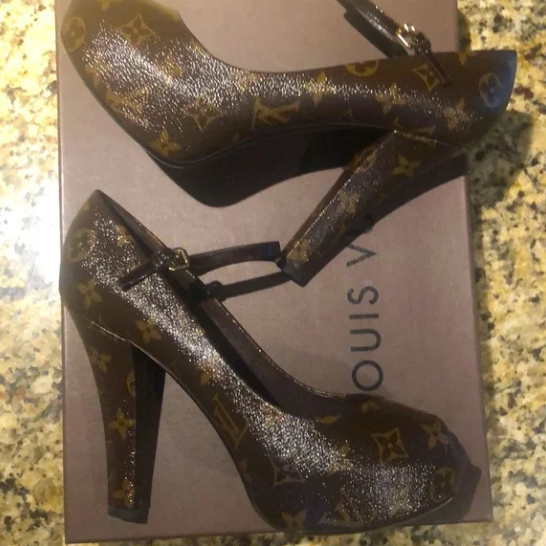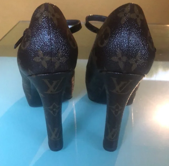 these rare authentic Louis Vuitton’s are Mary Jane style with a peep toe. Brown coated canvas with leather trim. Heel height is 5” with a 1” platform. Size 10 IT 40