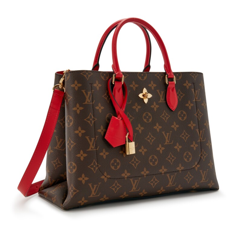 2020 red leather and brown Monogram coated canvas floral handbag gold hardware