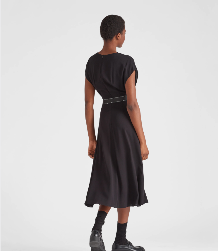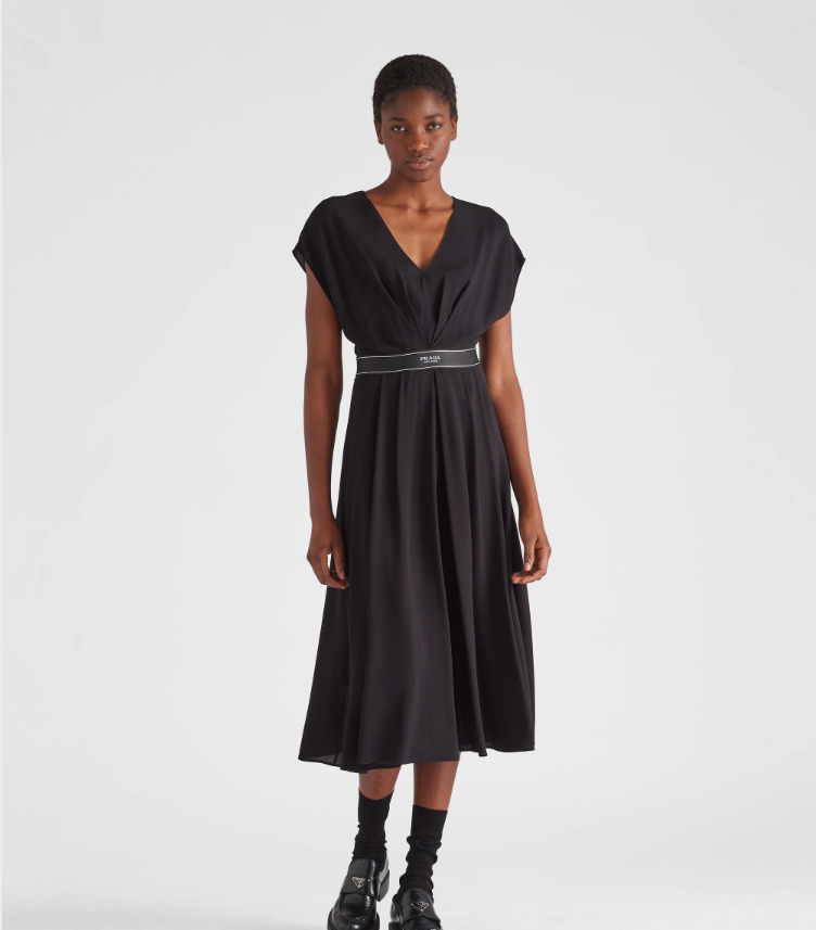 Simple retro lines and bold and delicate details meet this deep V-neck Sablé mid-length dress, creating a feminine silhouette. The elegant elastic waistband is decorated with a logo to add a sporty touch.
