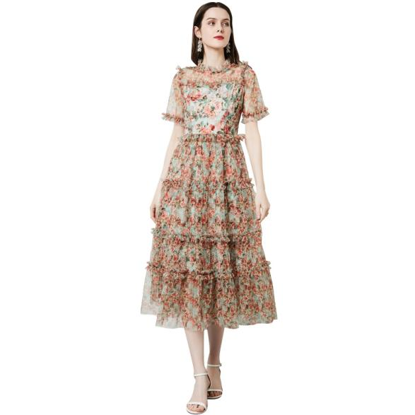 : 2022 New summer European and American fashion net red wind printing gauze big swing dress son slim French