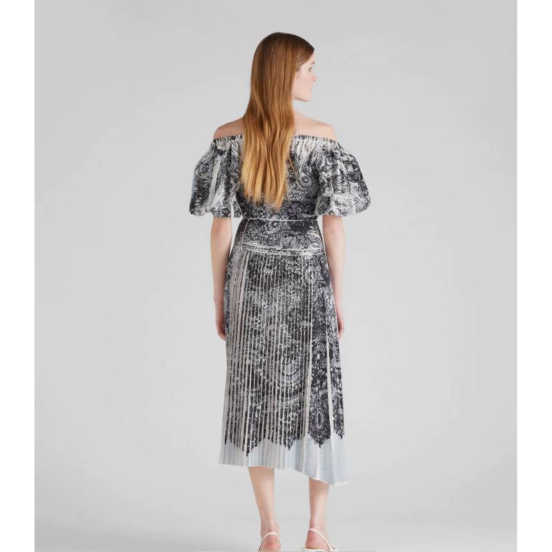 Diverse styles meet to create this dress, which presents a harmonious aesthetic contrast. The idea of ​​mixing and matching permeates Prada's narrative language, translating into creative designs through playful fusion of materials, silhouettes and functions. A screen-printed lace pattern accents the skirt, and the cropped neckline and puffed short sleeves accentuate the silhouette, making it unique.