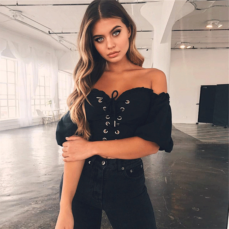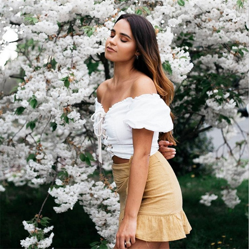 Applicable age: 18-24 years old size: S M L Fabric: Polyester pattern: solid color style: Street street: European and American collar type: One-word collar popular elements: tie tie hallow main color: white yellow khaki black sleeve type: Regular article Number: T1033 Ingredient content: 86% -95% Pattern Culture: Creative Year Season: Summer 2021 Sleeve Length: Short sleeve Length: Short style Style: Slim