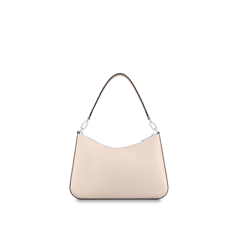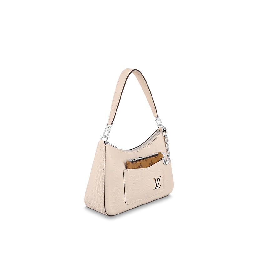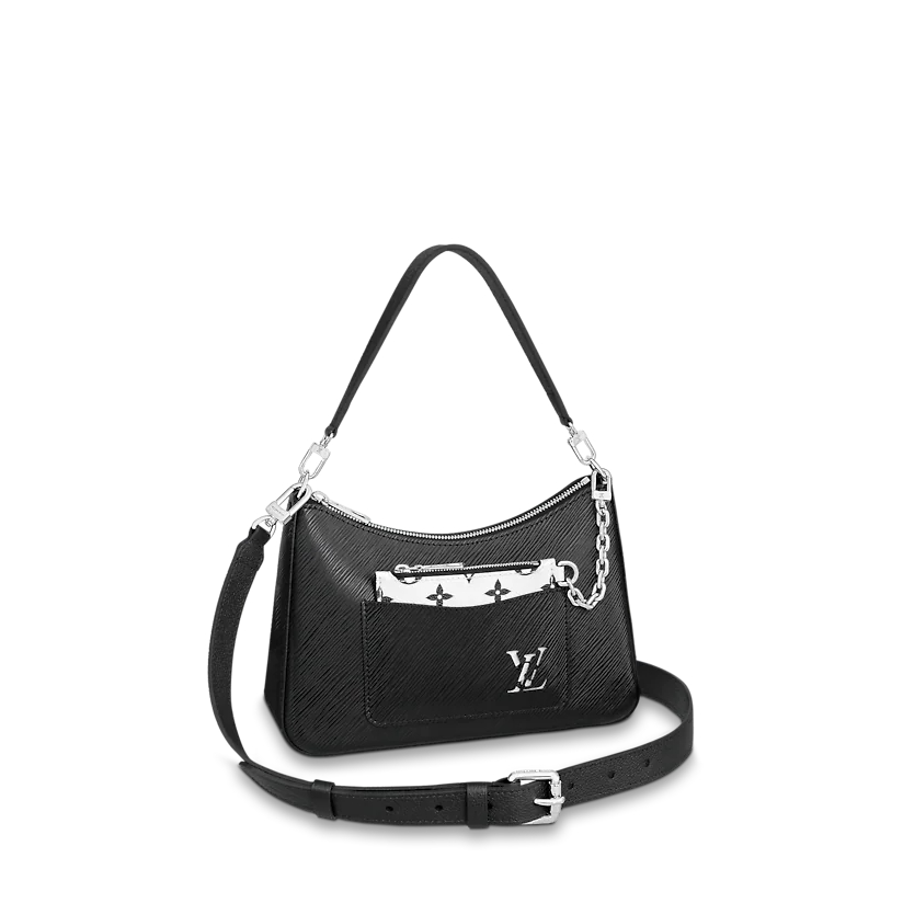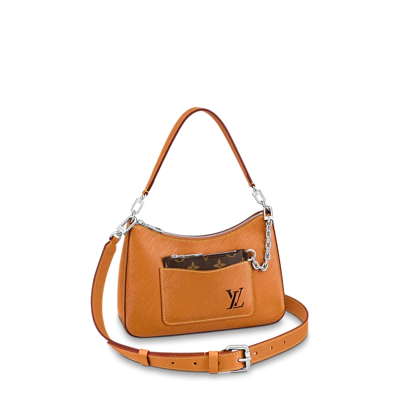 This Marelle handbag is made of granular Epi leather and comes with a detachable canvas bag attached to the bag with a chain strap.