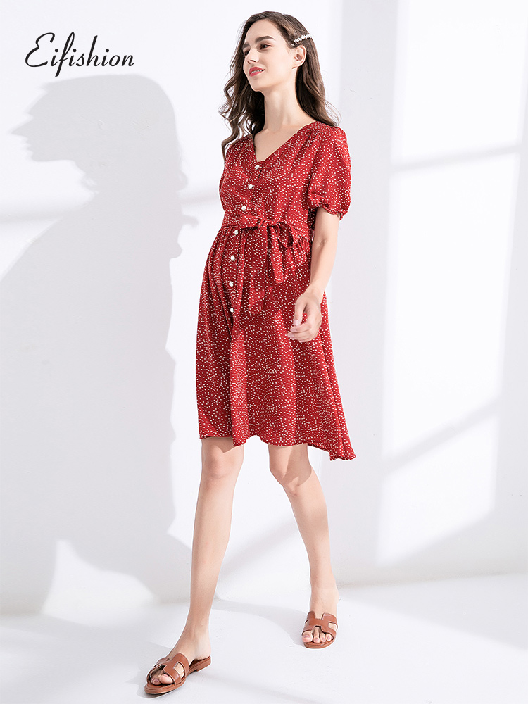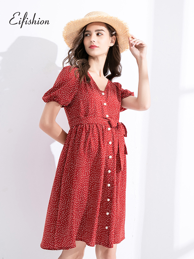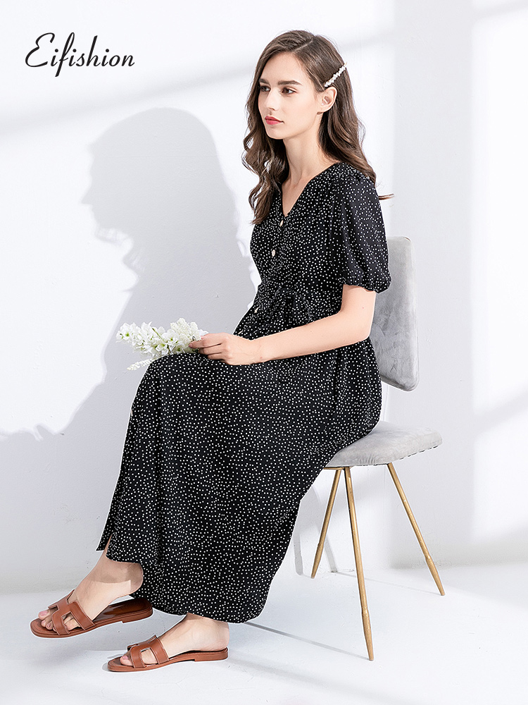 Material: Chiffon size: XS S M L design: polka dot style: Europe and America collar type: V collar Origin: China mainland province: Sichuan City: Chengdu Color classification: black long red short size recommended reference Article No. : A202102C34 Suitable for season: summer sleeve length: short sleeve skirt length: long
