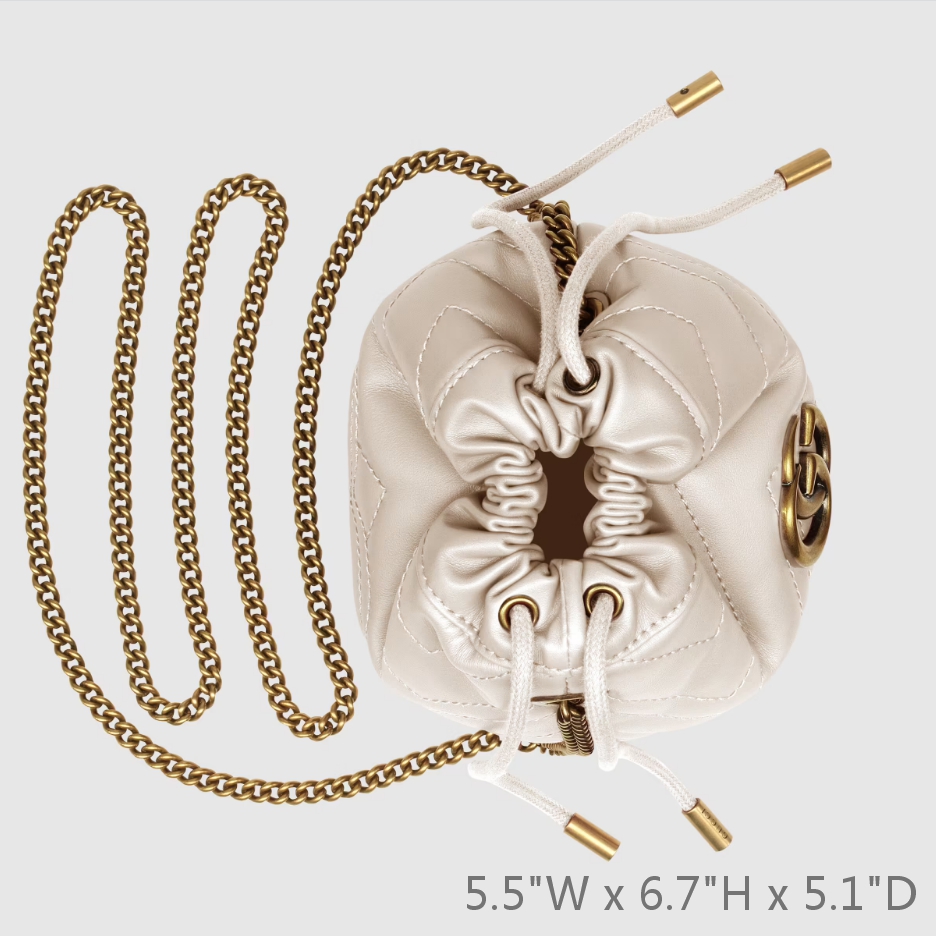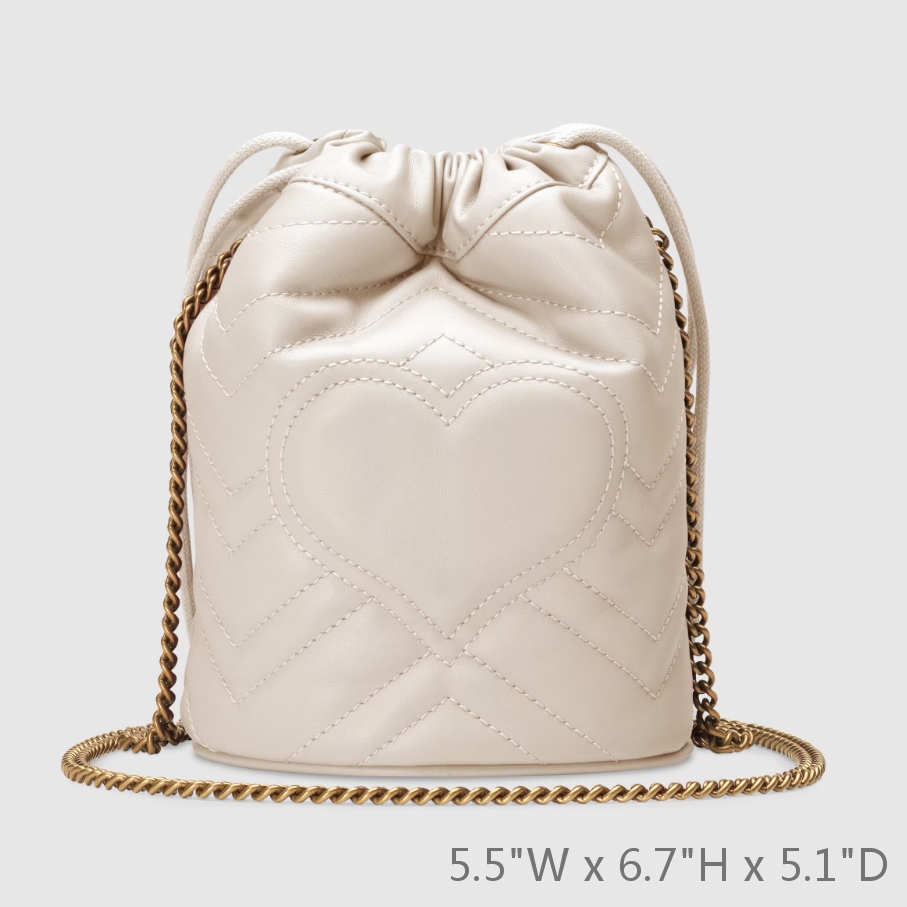 This mini bucket bag is made of white quilted leather with heart-shaped details on the back. The GGMarmont series features iconic double G hardware accessories-a modern interpretation of the 1970s Gucci file belt buckle.