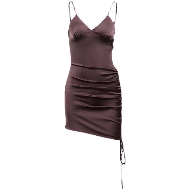 European and American satin single side drawstring V-neck halter dress Slim back sleeveless spice girl hip wrap skirt skirt