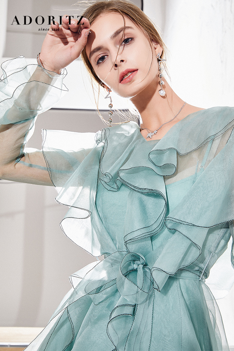 Suitable age: 25-29 years old size: XS Spot 15 days M Spot 15 days Fabric: Organza pattern: solid color style: sweet and sweet: Rui-Li collar: V-neck waist type: mid-waist garment front: pullover color classification: pea green sleeve type: Lotus leaf sleeve combination form: Single item No. : A3D1831406 Skirt type: A-line skirt applicable season: Summer Year season: Spring 2018 Sleeve length: Long sleeve skirt length: MIDI Skirt Popular elements/technology: Flounces three-dimensional decoration style: Other /other Profile: A Profile Quality composition: Mulberry silk 100%