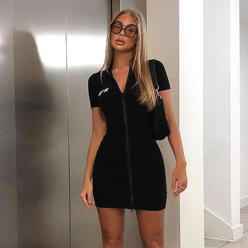 European INS fashion solid color letter printing short sleeve zipper dress 2022 spring new slim skirt