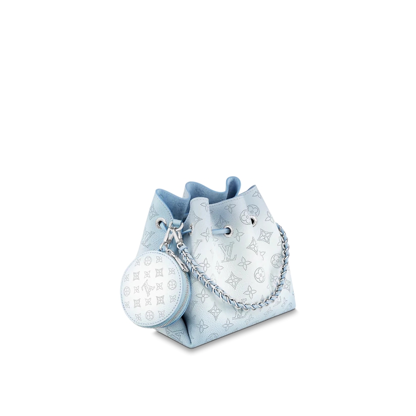 This compact bucket bag is equipped with rope opening and closing and comes with a detachable round change wallet.