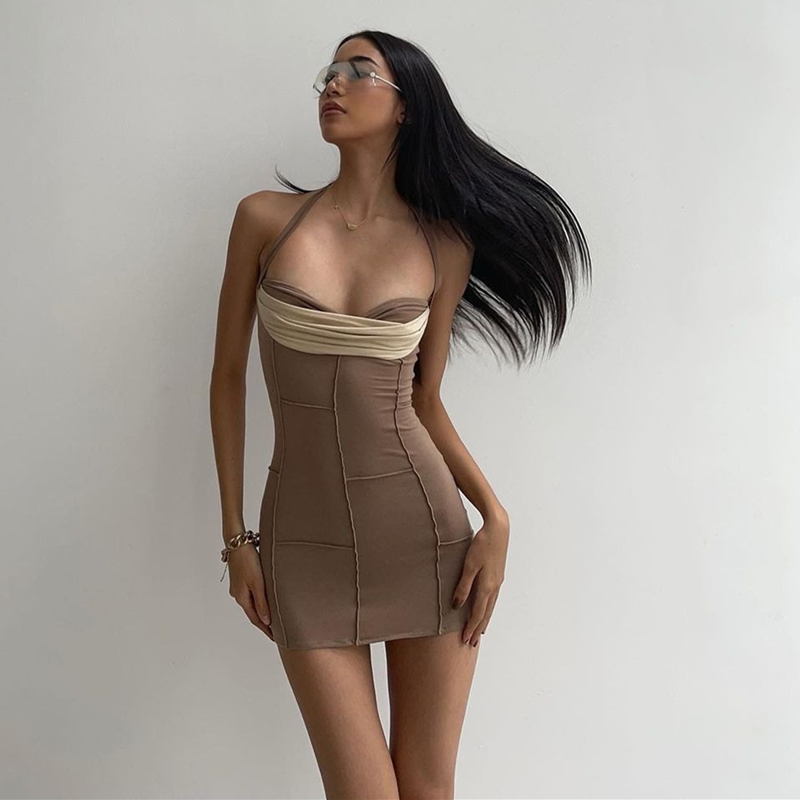 Applicable Age: 18-24 years old size: S M L Fabric: other patterns: solid color style: Street collar: one-word collar waist: high waist garment Front: pullover color classification: brown sleeve type: conventional combination form: single item No. : 4009A Skirt Type: Hip skirt applicable season: Summer Year season: Summer 2022 Sleeve length: Sleeveless skirt length: Short skirt popular elements/technology: Backless stitching style: sling profile: H Profile quality composition: other materials
