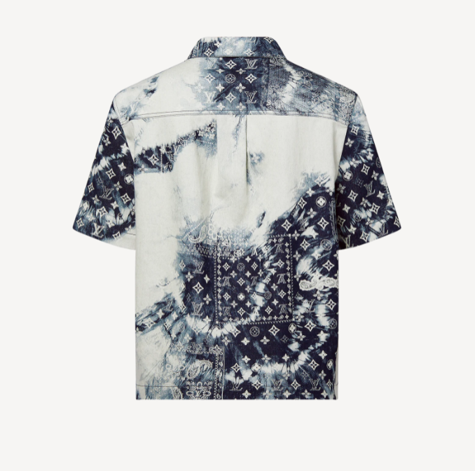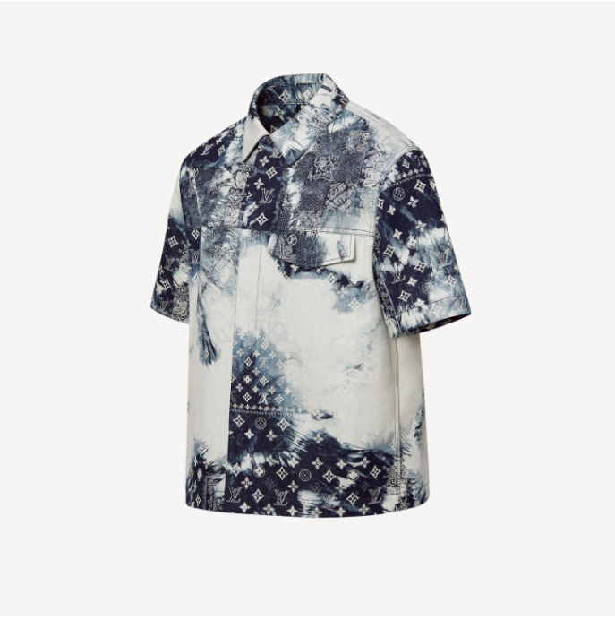 This short-sleeved shirt is made of Japanese-style denim with fresh lines, and the details are enriched by the concealed button front, flat hem and flap pocket on the left side. Full-width Monogram silk scarf printing shows bleaching tie-dyeing effect, which is achieved by the decoloring process of discharge dyeing technology.