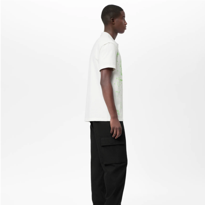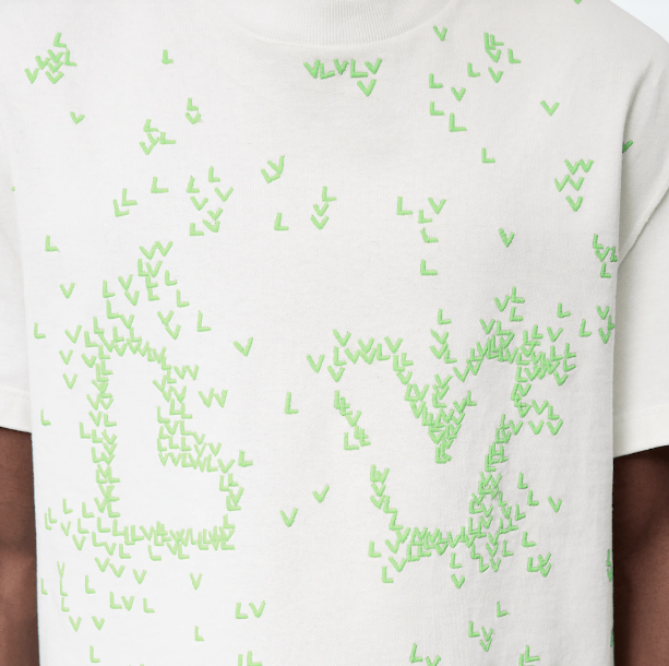 This T-shirt embroidered the scattered L and V characters with bright yarn, and gradually outlined the LV logo on the chest. A classic version is cut out of a compact cotton knit with a ribbed neckline, flip stitch and back label.
