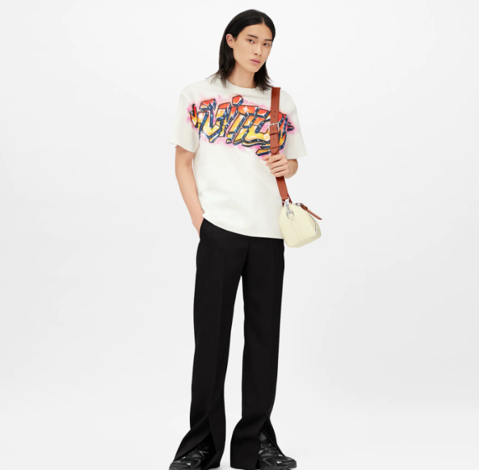 This cotton knitted T-shirt transforms hand-painted patterns into digital prints, such as graffiti, which extends from the chest to the sleeves, showing the street artistic style.