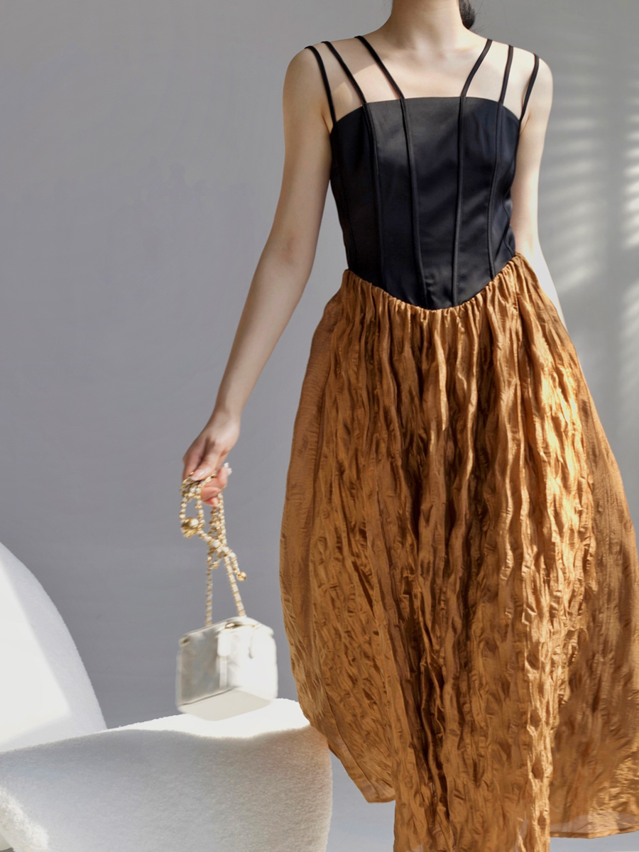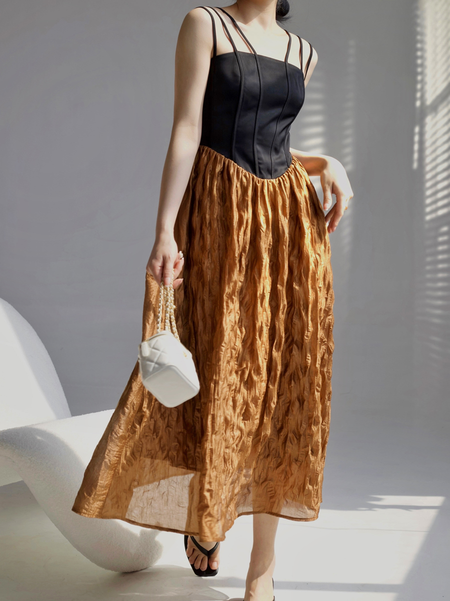 Size: XS S M L Style: Commuter waist type: high waist Color classification: black and brown stitching (spot) black and brown stitching (pre-3 working days delivery) Article No. : 22TN023 year season: summer 2022 Sleeve length: sleeveless skirt length: long skirt style: sling material composition: polyester fiber