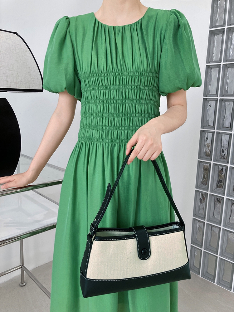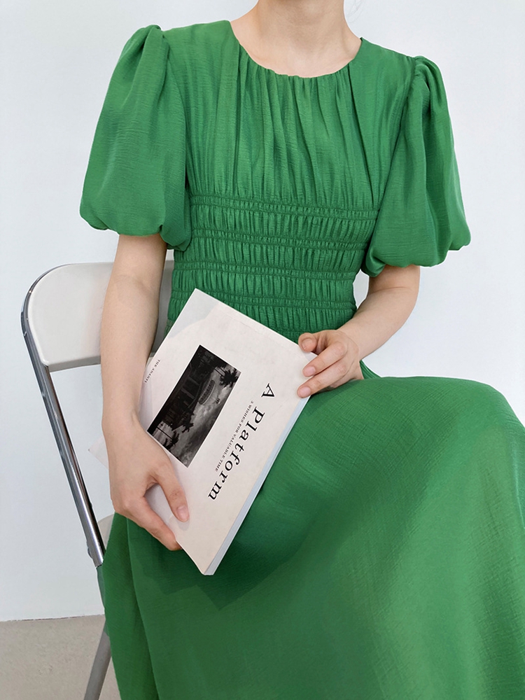 Age: 25-29 years old Size: M L Design: Solid color style: sweet: Rui-Li collar: Round collar waist: High waist skirt Front: pullover color classification: emerald apricot sleeve: Bubble sleeve Combination form: single skirt: A-line skirt Applicable season: Summer Year season: Summer 2022 Sleeve length: Short sleeve skirt length: MIDI skirt Popular elements/technology: Pleated profile: A Profile quality composition: polyester fiber