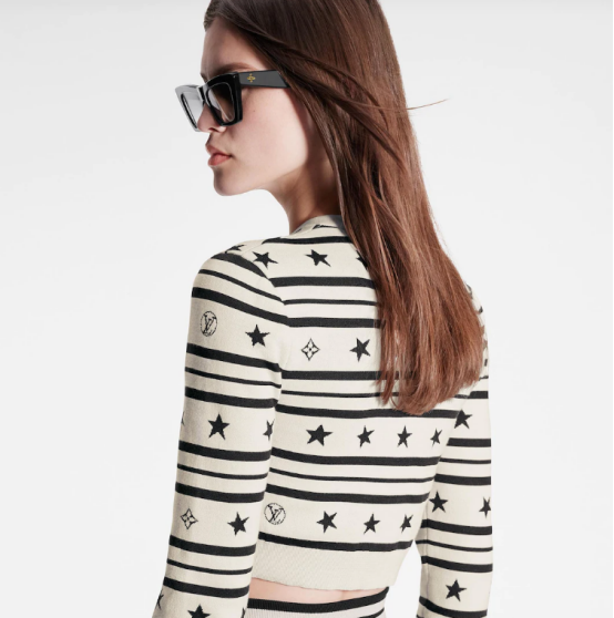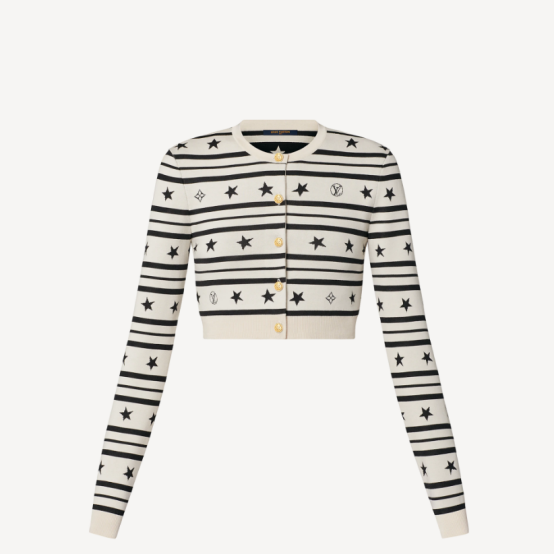 This short cardigan depicts the interesting stripes of LV Summer Stardust capsule series with jacquard technology, and arranges the star pattern and brand logo casually. Silk-cotton blended knitting brings comfortable texture, and brass LV buttons inject dynamic vitality.