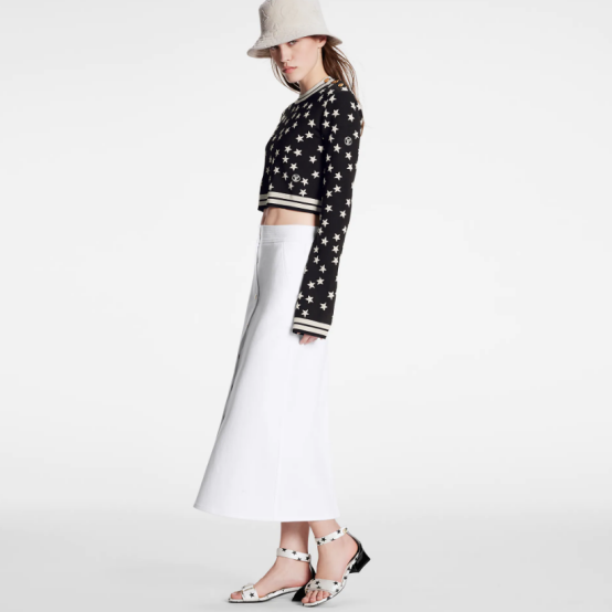 This mid-length skirt comes from LV Summer Stardust capsule series. It is made of elastic cotton gabardine, with a refined silhouette, high waist design and side pockets. Unlock the Louis Vuitton brass snap, and the charming style will be revealed immediately.