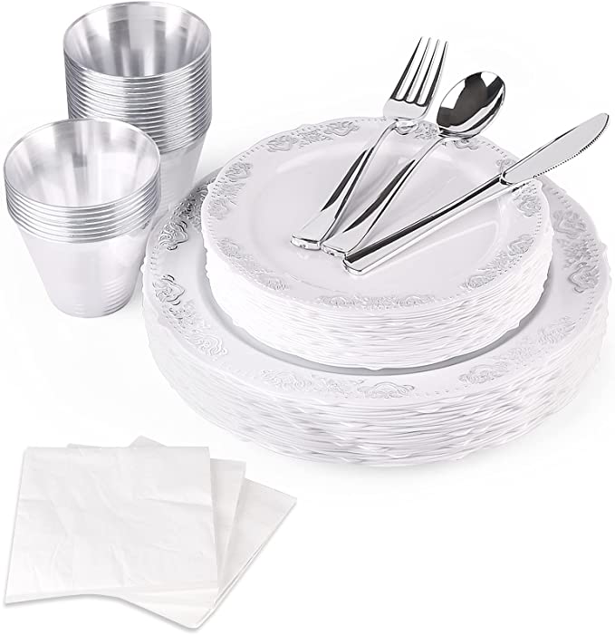 SUITABLE FOR ALL OCCASIONS: These White Silver Plastic Cutlery 5 Piece Party Sets can be combined or used individually. Perfect for weddings, Christmas, Thanksgiving, birthday parties and other large events, silverware set for 25 guests.