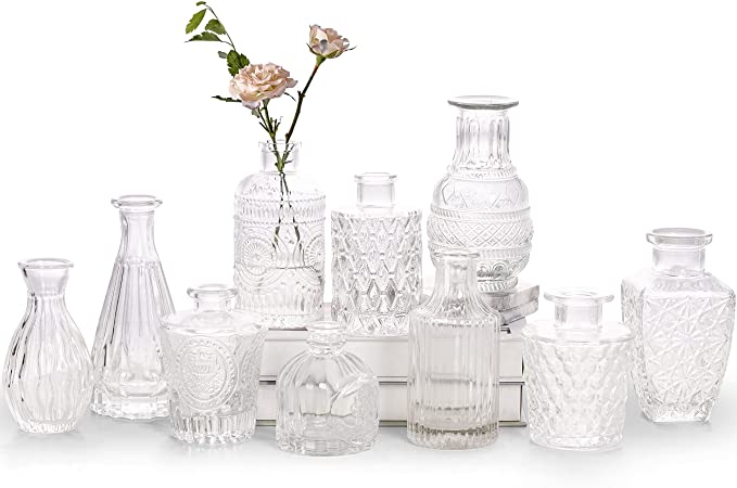 Glass Bud Vases Set of 10 - Small Vases for Flowers, Bulk Clear Bud Vases, Center Decor Cute Glass V