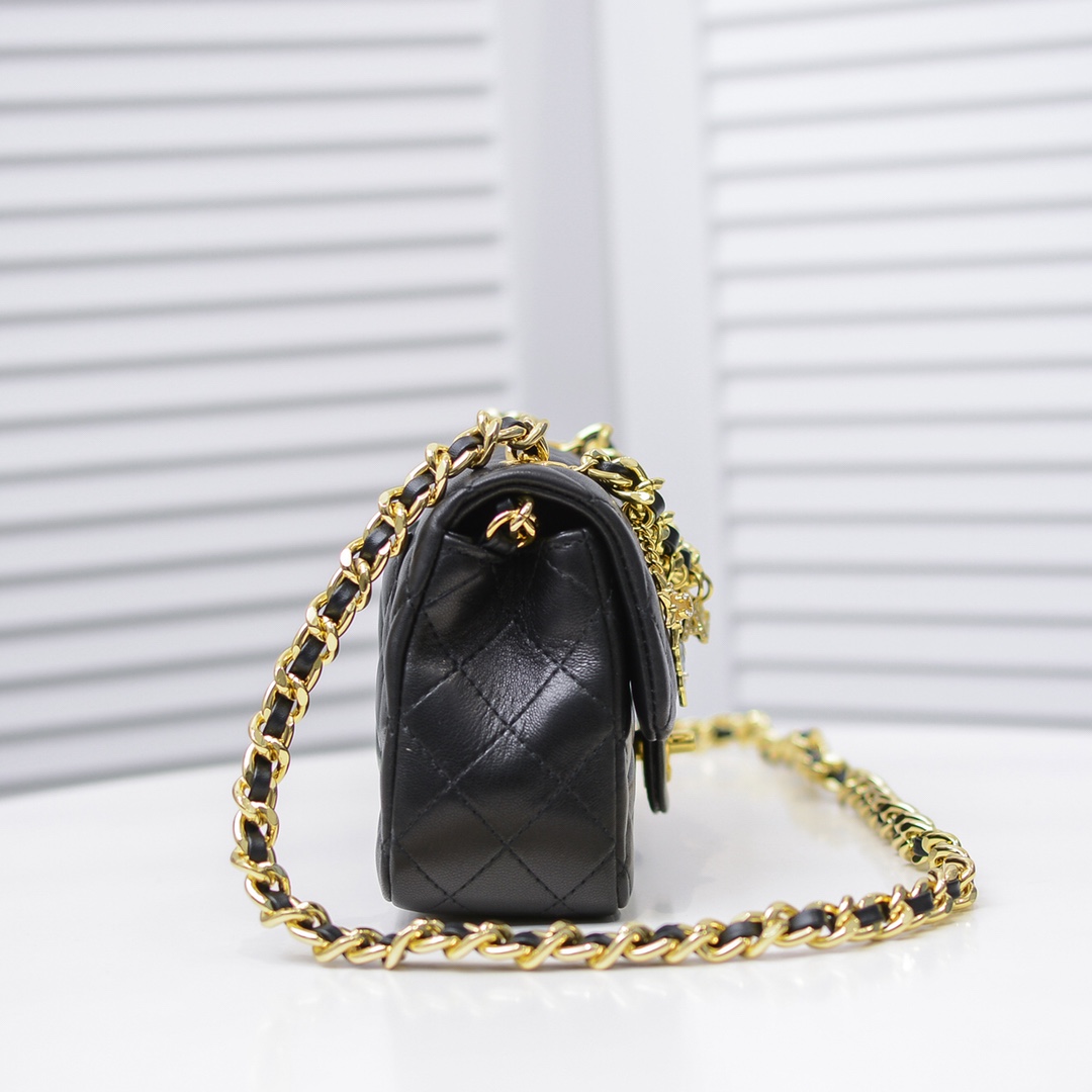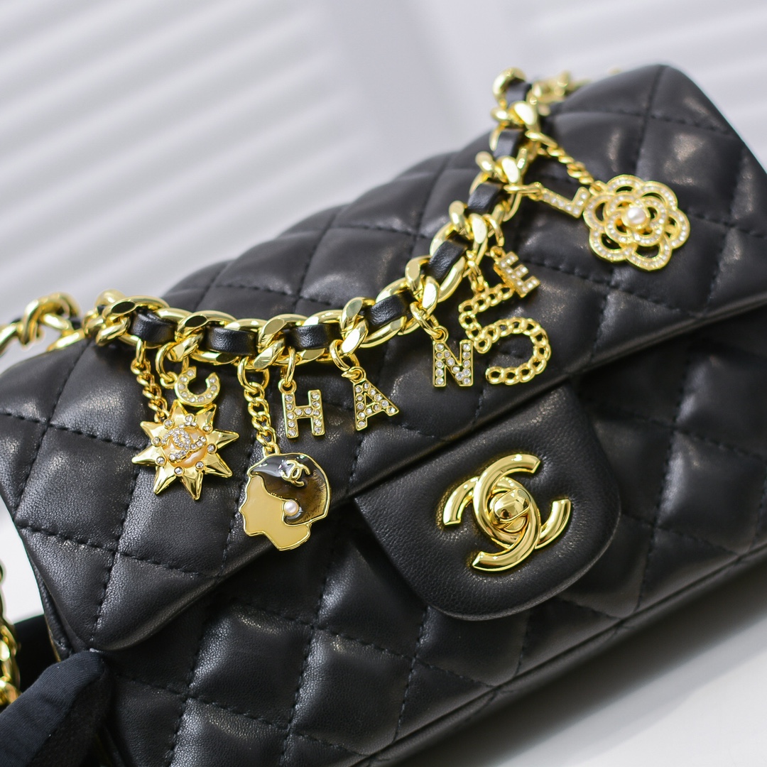?Chanel 2021' s latest limited edition mini cf classic rhombus flap bag in early spring is decorated with rough chains and exquisite pendants, including chanel letters, the sun, the silhouette of Chanel lady, N 5 and a hollow camellia, which embellishes the handbag, stands out from the crowd and represents eternal elegance. Size: 20x12x6cm model number: 2326