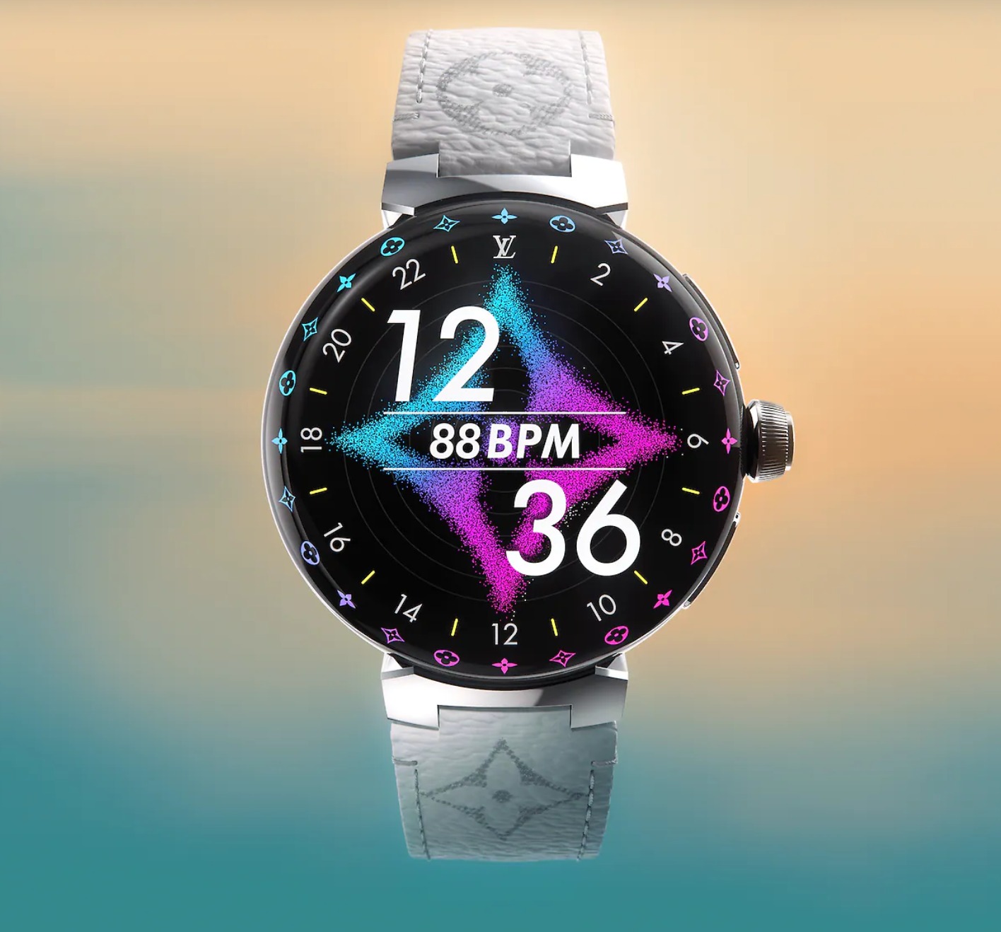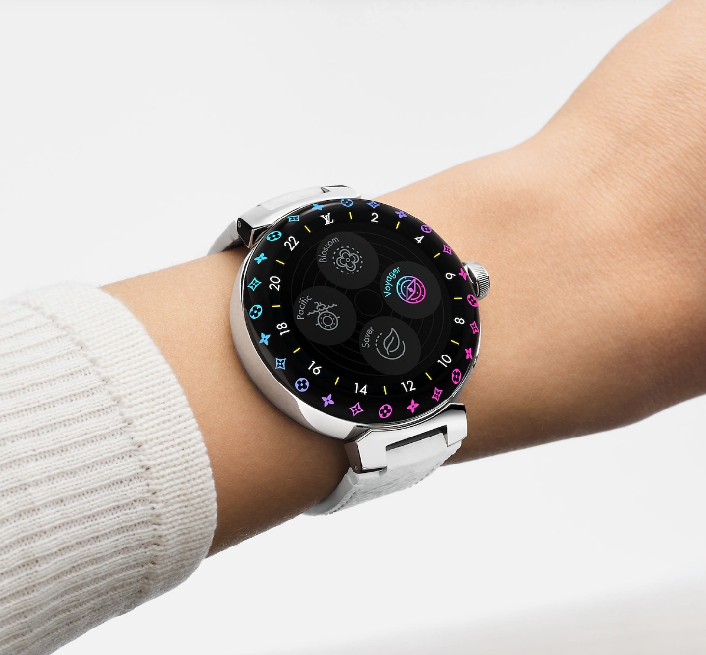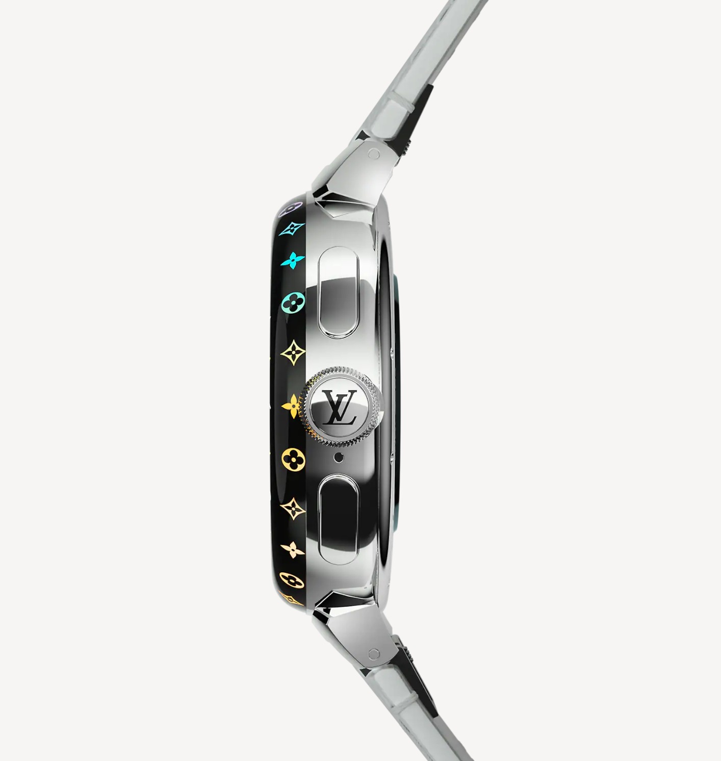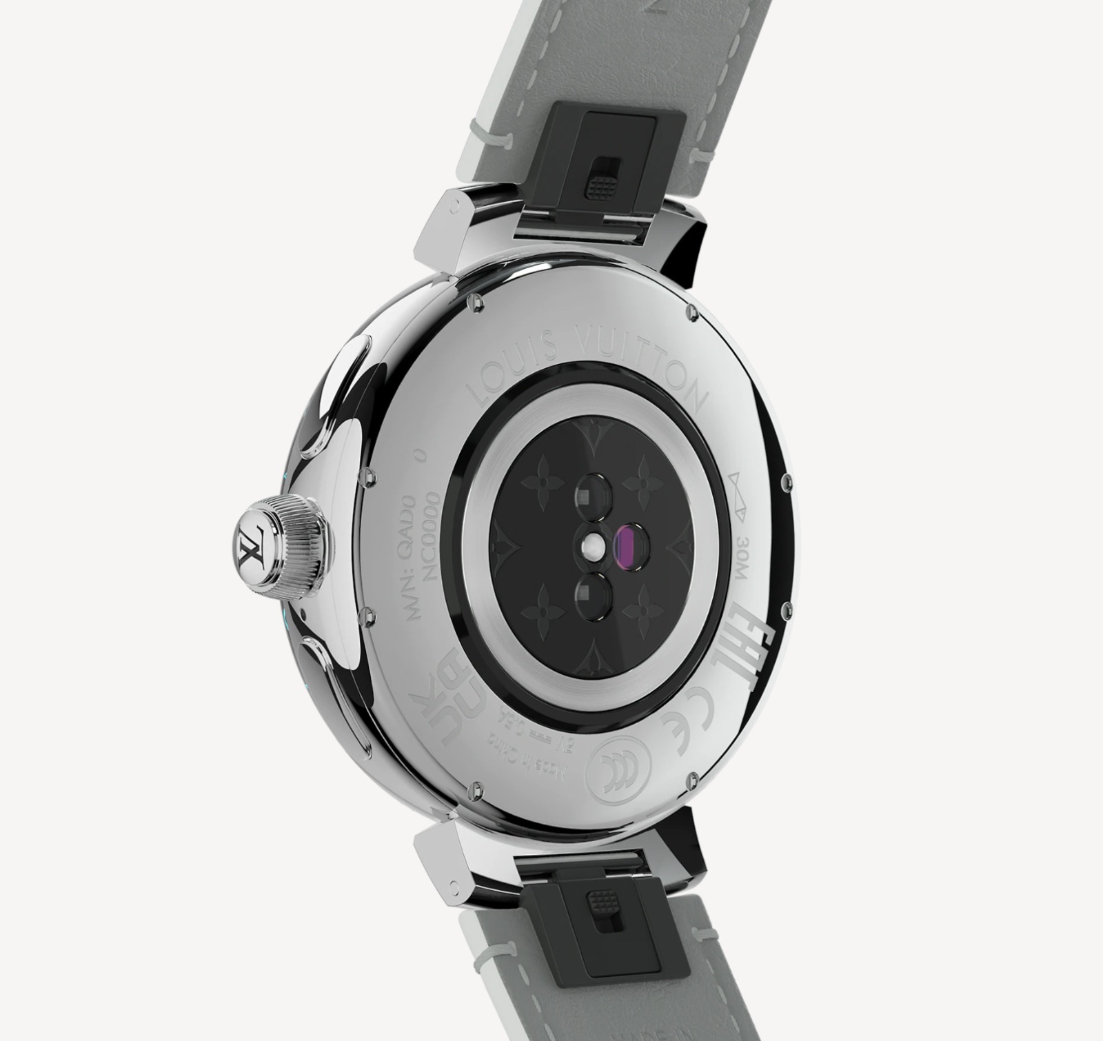 Anse: acciaio Pulsante lucido meccanico: acciaio lucido, decorato con logo LV laccato Fondello: acciaio lucido, ceramica con motivo monogramma Vetro zaffiro Anello fodera quadrante 24 ore decorato con luce di fondo a LED