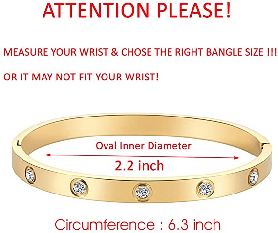 ♣ The love bracelet has an inner circumference of 6.3 inches (about 16 cm) and an inner diameter of about 2.2 inches (about 5.6 cm) x 1.8 inches (about 4.6 cm), which fits most wrist sizes. Please refer to the photos and style names in the listing to determine your size and color before purchasing. The sparkling gemstones are perfectly set on the bracelet to fully show the love and make you more beautiful. The perfect everyday accessory to add a touch of style to your outfits.