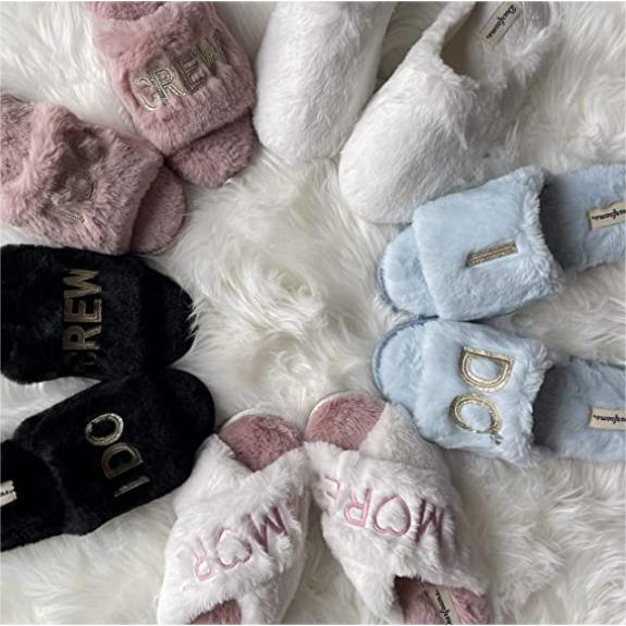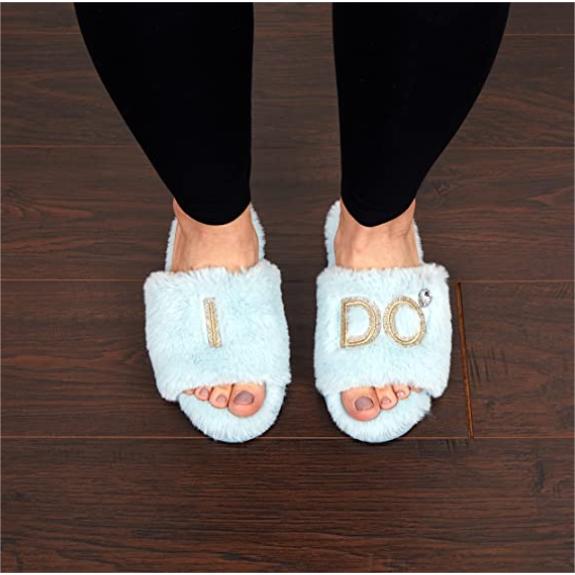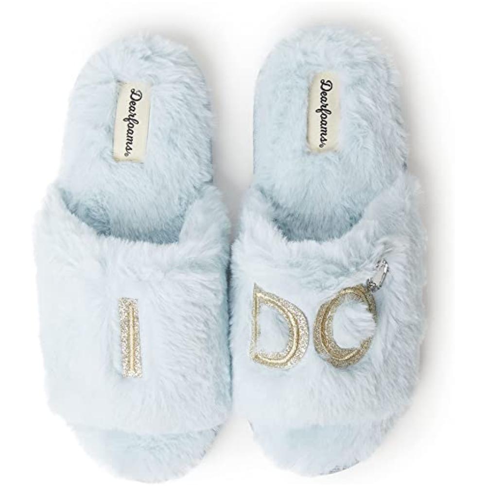 Make their day even more memorable with the Dearfoams Women’s Novelty Slide Slippers. Whether you’re the bride or part of the bridal party, these festive slippers will be the perfect accoutrement to the Big Day. Part of the Dearfoams Gifting Collection of matching slippers, these bridal slippers are the perfect gift for the Bride to Be – or yourself! These adorable, plush bridal slippers feature “I DO” or “I DO CREW” in a beautiful gold metallic sparkle applique. The white bridal variation features an oversized diamond ring embellishment to celebrate the most magical day of her life. Eye-catching and incredibly comfy, the scuff slippers are fit with a multi-density cushioned insole and topped with memory foam for a cloud-like feeling for her well-deserving feet. With an indoor/outdoor outsole, the bottom of the slippers is durable for constant support no matter where the day takes her.