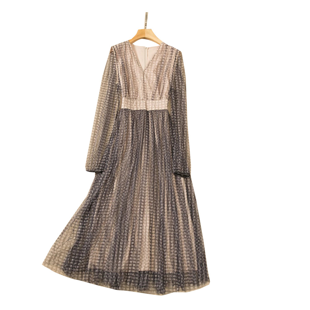 Focus on fashion European and American women's new light luxury ladies V-neck long-sleeved prismatic mesh slim-fit mid-length dress