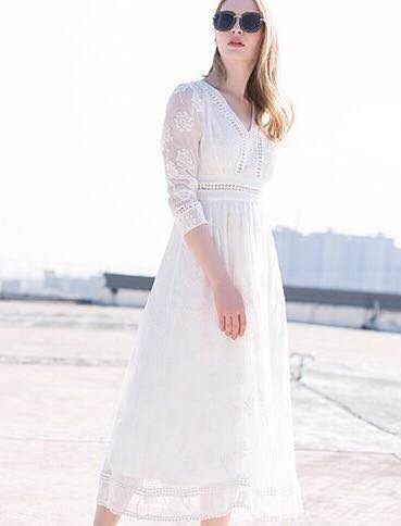 European and American station 2018 new spring and summer celine women's silk dress hollow lace mid-length