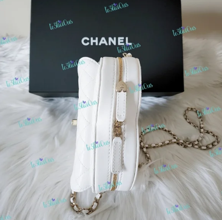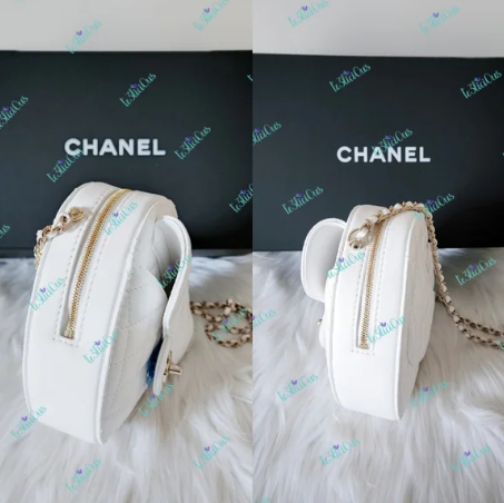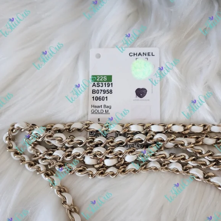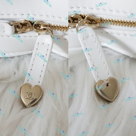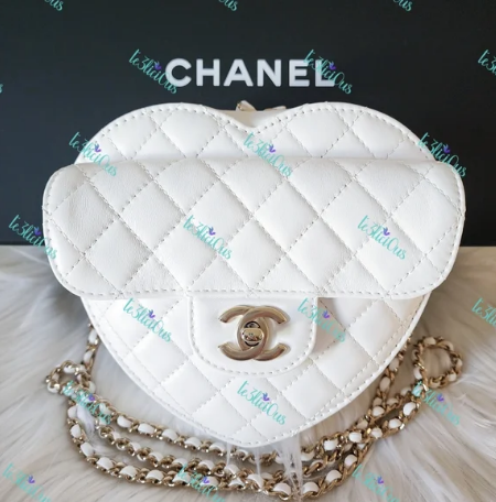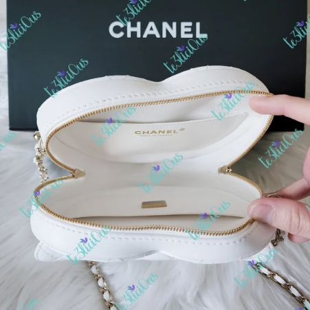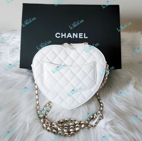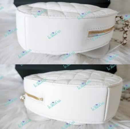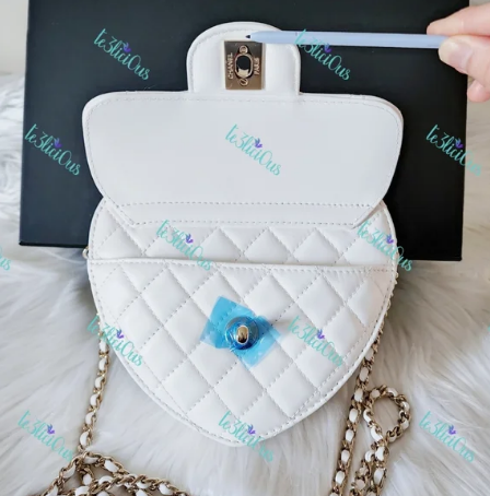100% AUTHENTIC AND BRAND NEW Bag: LAMBSKIN HEART LARGE BAG ( Material: LAMBSKIN Hardware: GOLD HARDWARE Color: WHITE Condition: 100% BRAND NEW CLOSURE: TURN LOCK Serial number: (microchipped) Comes with: Bag, Dust Bag, ribbon, and copy of receipt (personal information crossed out) 7" length x 6.4" height x 2.5" width, Strap Drop: 20"
