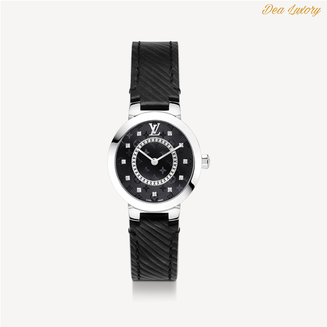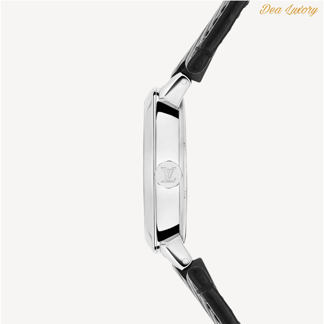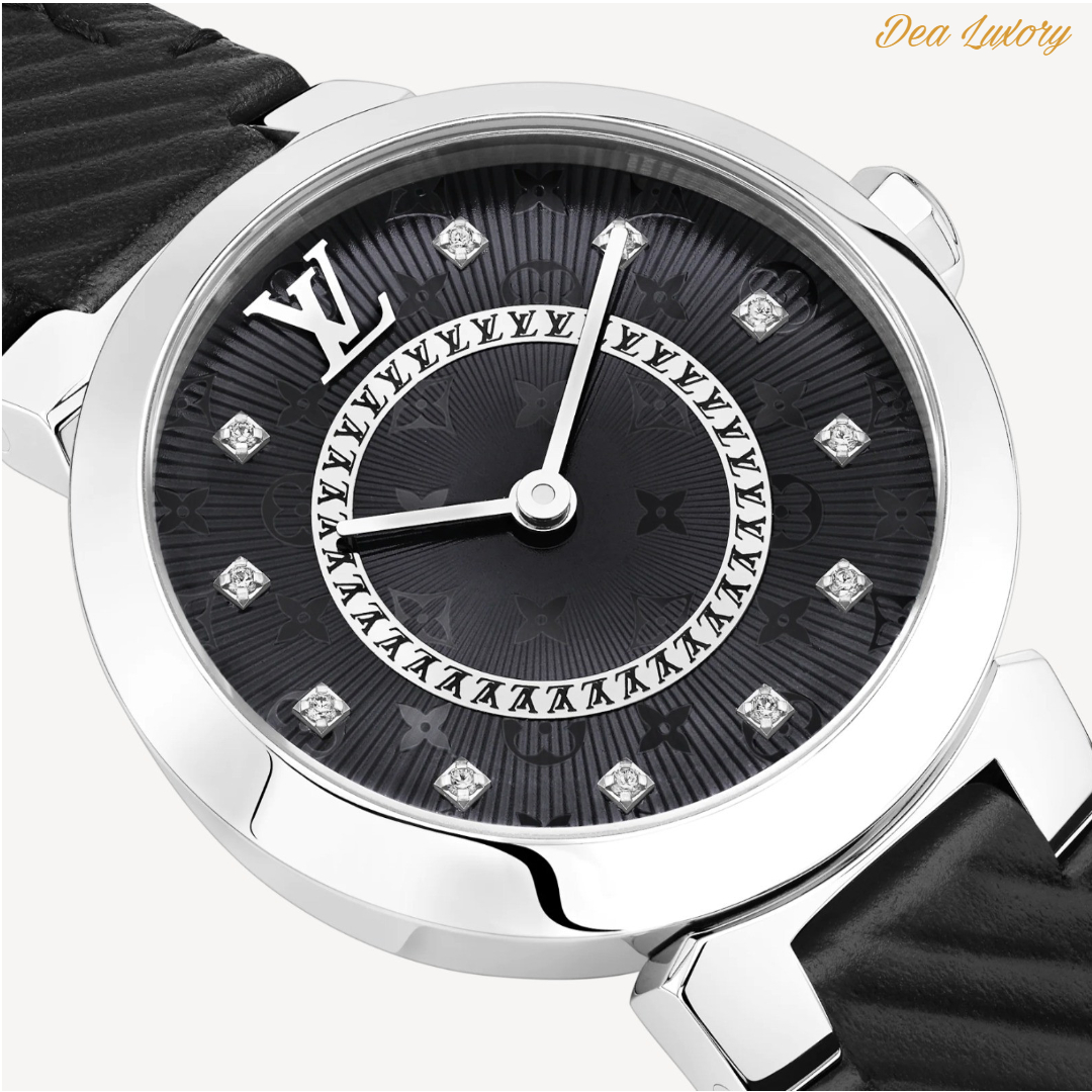 UV engraved dial with full Monogram pattern, hands set with diamonds, mirror polished LV rimmed minute scale, 12 o'clock decorated with LV letters.
