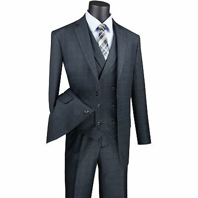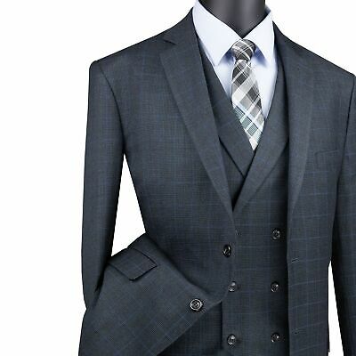 VINCI Men's Charcoal Gray Glen Plaid 3 Piece 2 Button Classic Fit Suit NEW