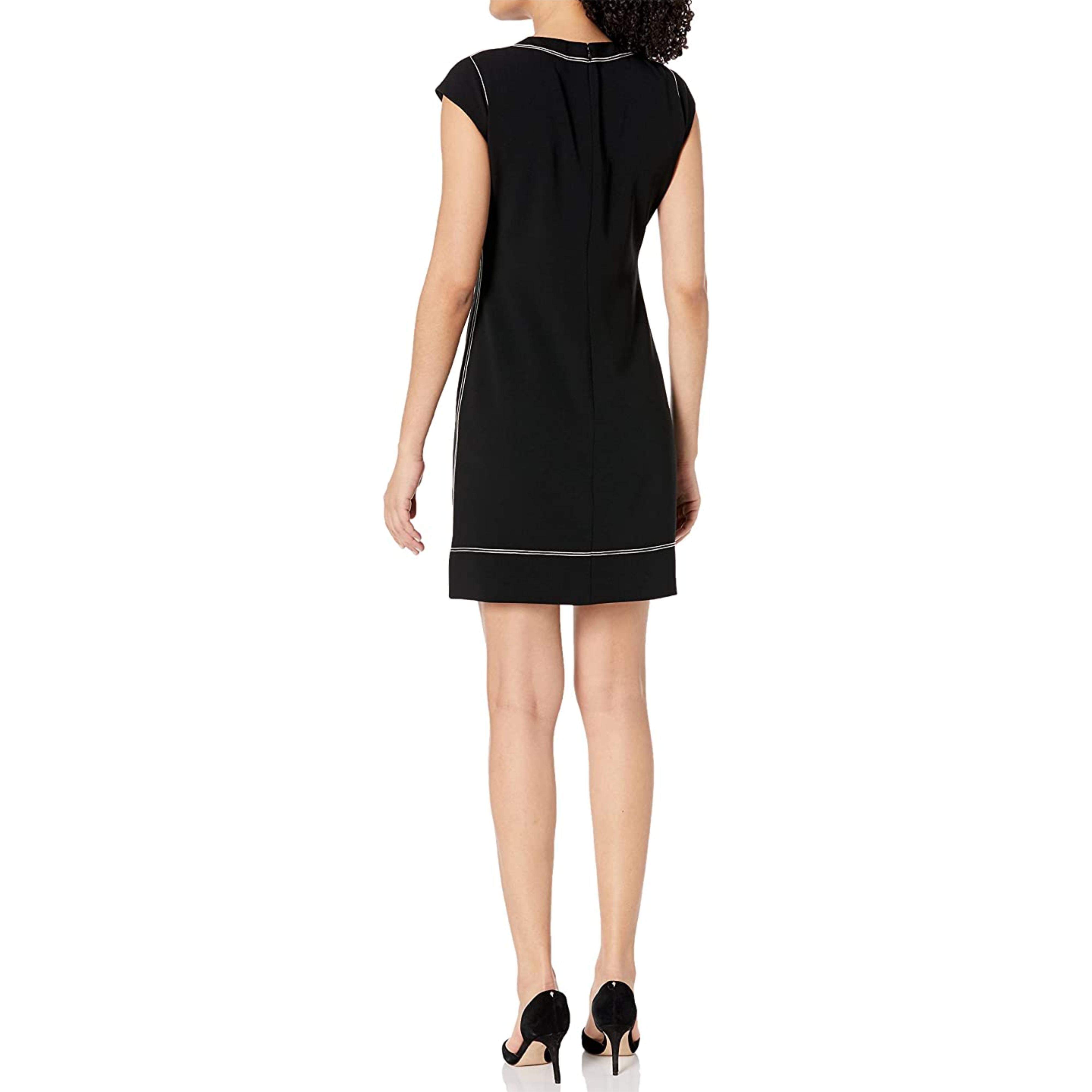 Mid-thigh cap-sleeve sculpted dress with intricate contrast chain embroidery detailing, framing the body.