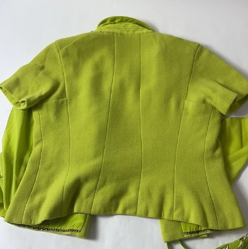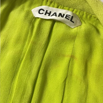 This is a Chanel Couture one of a kind 1960s 3 piece suit in a lime green color Since it is couture, there is not a size or care tag label. Estimated to be size XS The condition is very good for it's age: some makeup marks on inside of jacket lining (haven't tried to clean) Underarm discoloration on the matching beaded tank Jacket measurements: Length: 20" Armpit to armpit: 17.5" Skirt: Length: 22" Waist lying flat: 12.5"