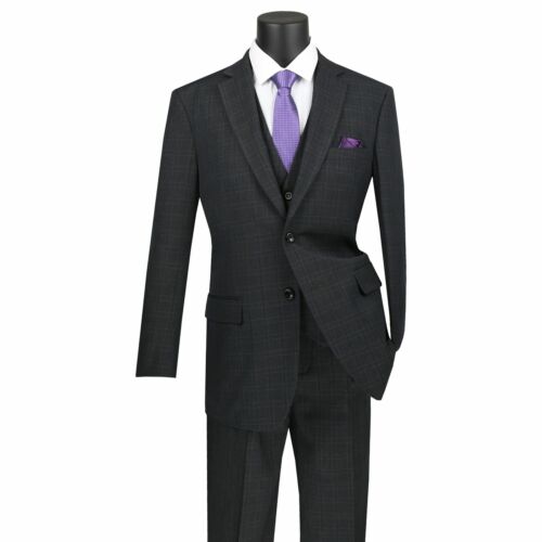 VINCI Men's Black Windowpane Plaid 3 Piece 2 Button Classic Fit Suit NEW