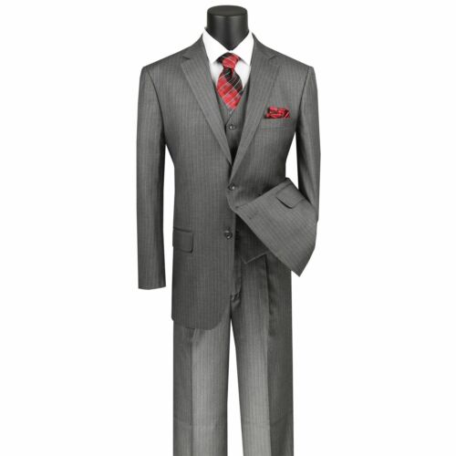 VINCI Men's Medium Gray Pinstripe 3 Piece 2 Button Classic Fit Suit NEW
