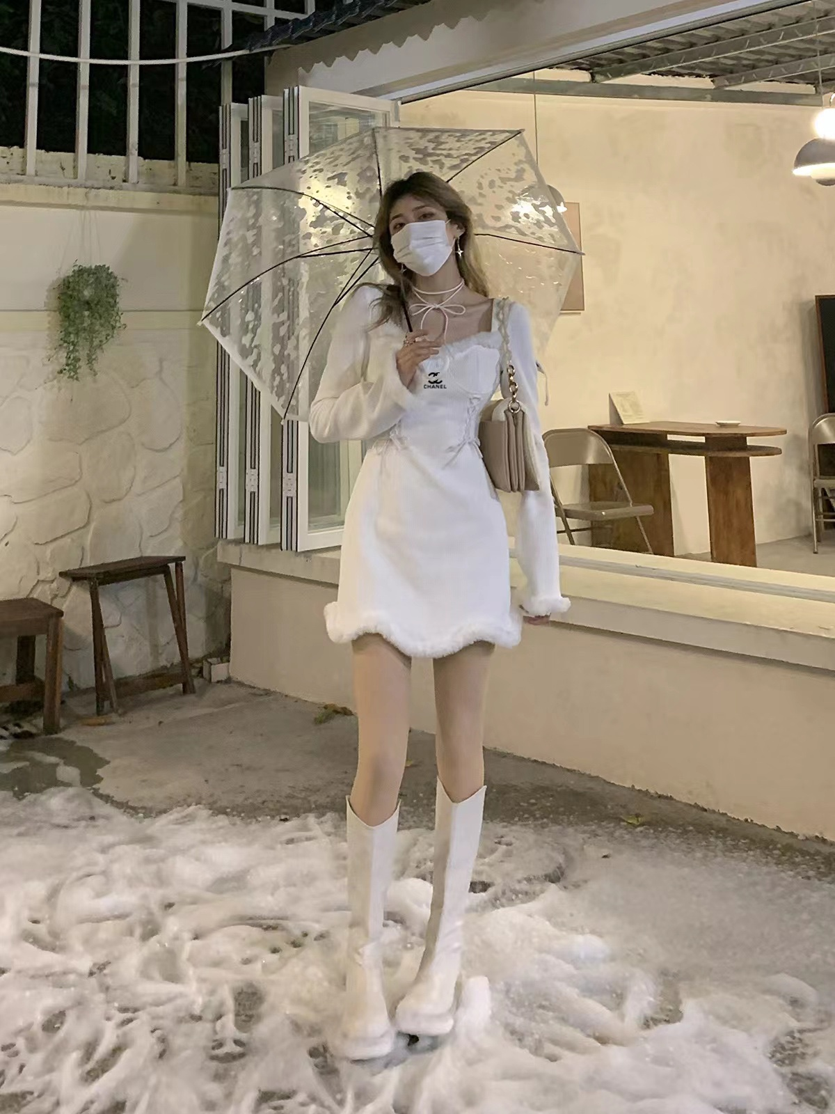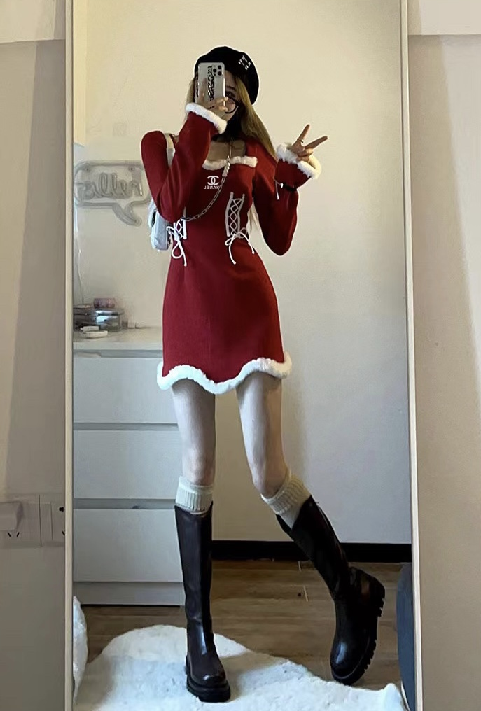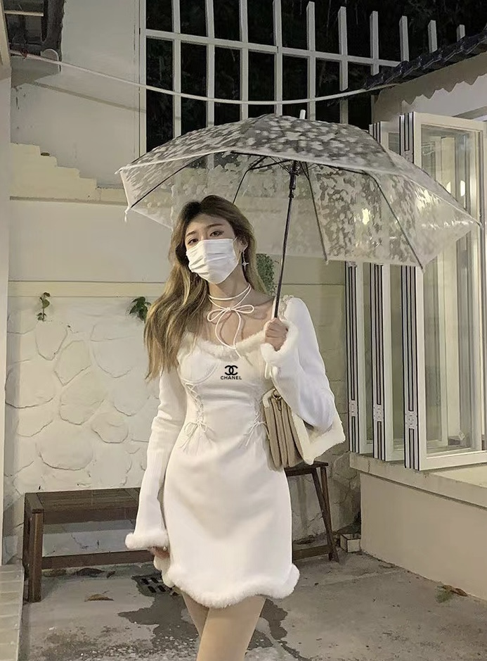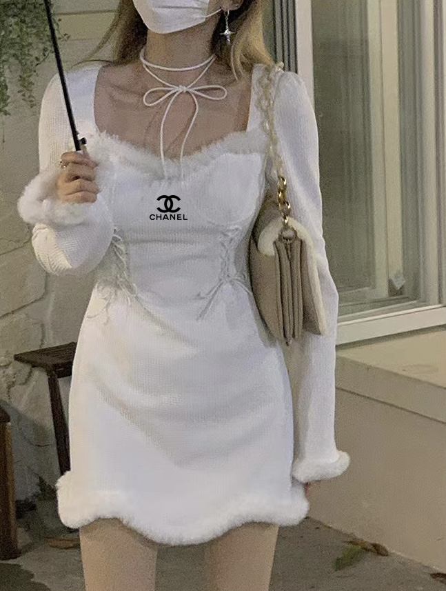 Chanel Christmas Snow White dress autumn and winter temperament Mao Mao edge long sleeve slim bottom