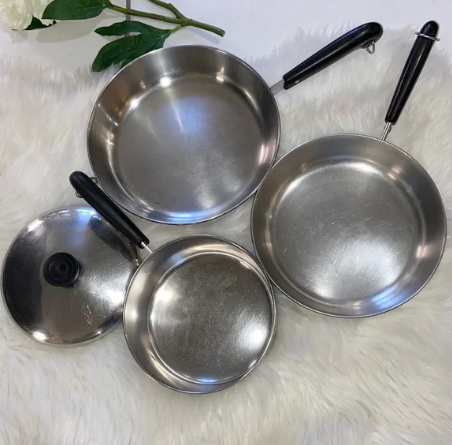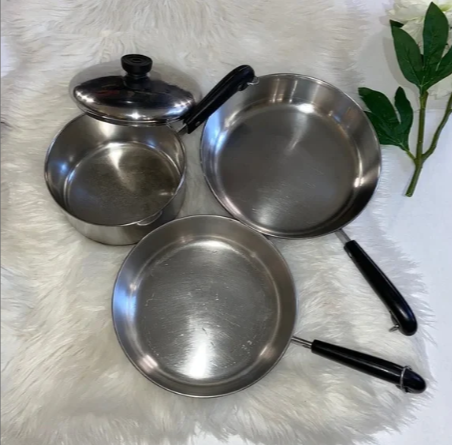 Used in good condition Have stains and show wear Vintage 1-9”inch pan Made in CLINTON. ILL. U.S.A. Second pan don’t have size but it’s a bit bigger do not have date marks are erased. 1-2 quart pot with Lid(handle on the lid is loose)marks has been erased unfortunately Handles on pots show wear some more then others. Set put together by me Has stain and scratches all over(inside and outside)and show wear. Will be ship pots nesting(together) Please see pictures for more product details Weights almost 5 pounds. Shipping is included Price is firm/reasonable offers will be considered Thank you! Selling as a set