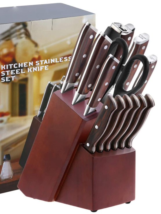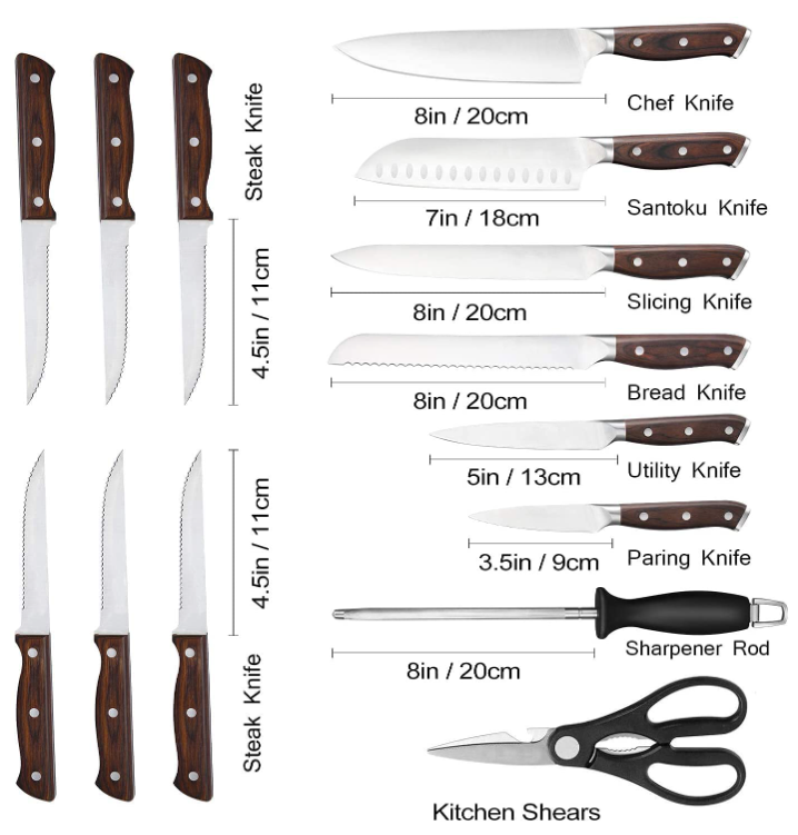 High-quality kitchen knife set-each knife is forged by a piece of high-carbon German stainless steel. Our high-quality steel and innovative design make the blade sharp, with hardness as high as HRC57, strong and durable, and balanced weight, which can * minimize * and at the same time * maximize the cutting accuracy. * Knife set-Each knife is carefully polished by hand and forged by precise tempering, and the edge of the knife is polished to 16-18 by hand to obtain * cutting experience and lasting sharpness. Ergonomically designed handles provide a comfortable and confident handling experience. Easy storage-all knives * are stored in pine knife holder with built-in sharpener for space-saving storage. Set-8 "chef's knife, 8" slicing knife, 8 "bread knife, 7" cutting knife, 5 "utility cutting knife, 3" paring knife, 6 "steak knife, 8" knife sharpening rod, 8 "knife sharpener, kitchen scissors, pine square. Easy Care–Kitchen knife sets with blocks are easy to clean and won't rust. All tableware sets are forged with German Steel X 5015 steel, which has excellent corrosion resistance and corrosion resistance. Our knives offer unlimited 1-year warranty. Note-For *, do not wash the knives in the dishwasher.