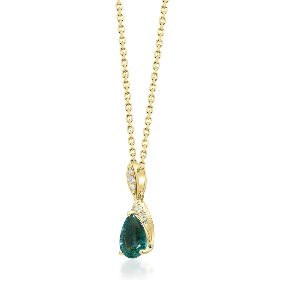 H-I Color, I1 Clarity. Comes ready to wear with 10K gold chain. The Pendant has 1.81 GM Gold & 0.64 Carat Pear-Cut Natural Zambian Emerald.