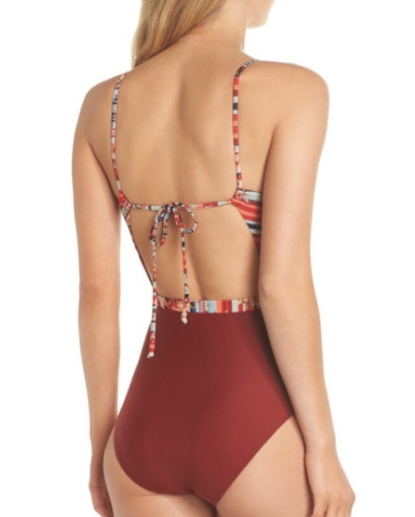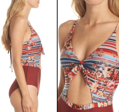 XS=2, S=4-6, M=8-10, L=12, XL=14. DETAILS & CARE A front cutout and strappy back details give the illusion of separates in this plunging, mixed-print one-piece. Moderate back coverage Adjustable straps Removable soft cups Lined 82% nylon, 18% spandex Hand wash, line dry Imported Women's Active & Swim