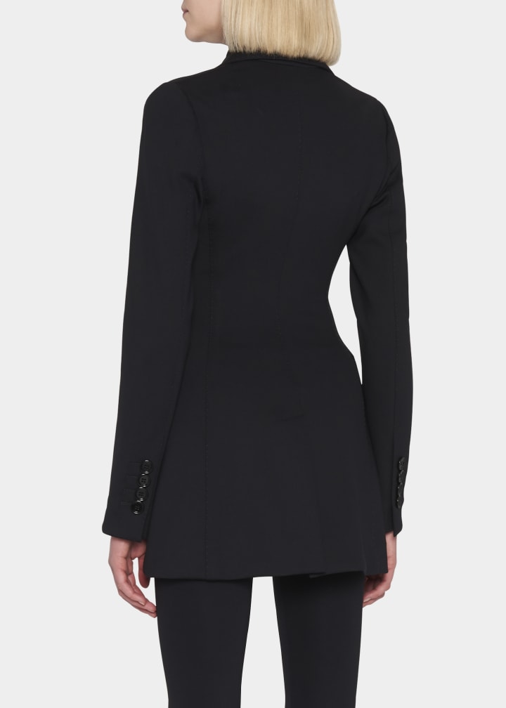 Dolce&Gabbana solid blazer jacket Peak lapels; double-breasted front Long sleeves; button cuffs Chest welt pocket; front flap pockets Slim fit Hem falls below the hip Nylon/spandex Made in Italy Model is 5'10"/177cm. Online Inquiries: BGS21_B7M8J | Store Inquiries: #4385097