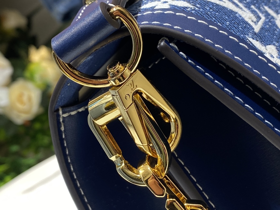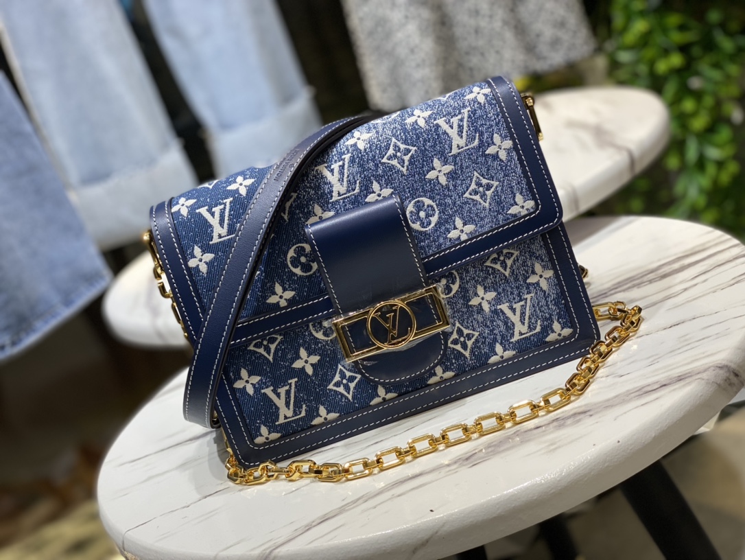 This dauphine medium-sized handbag is made of classic logo denim, which shows Louis Vuitton's unremitting pursuit of sustainable technology of denim, and conveys the neo-retro atmosphere together with cow leather trim. Removable chain and inner compartment add functional details. Dimensions: 25 x 17 x 10.5cm