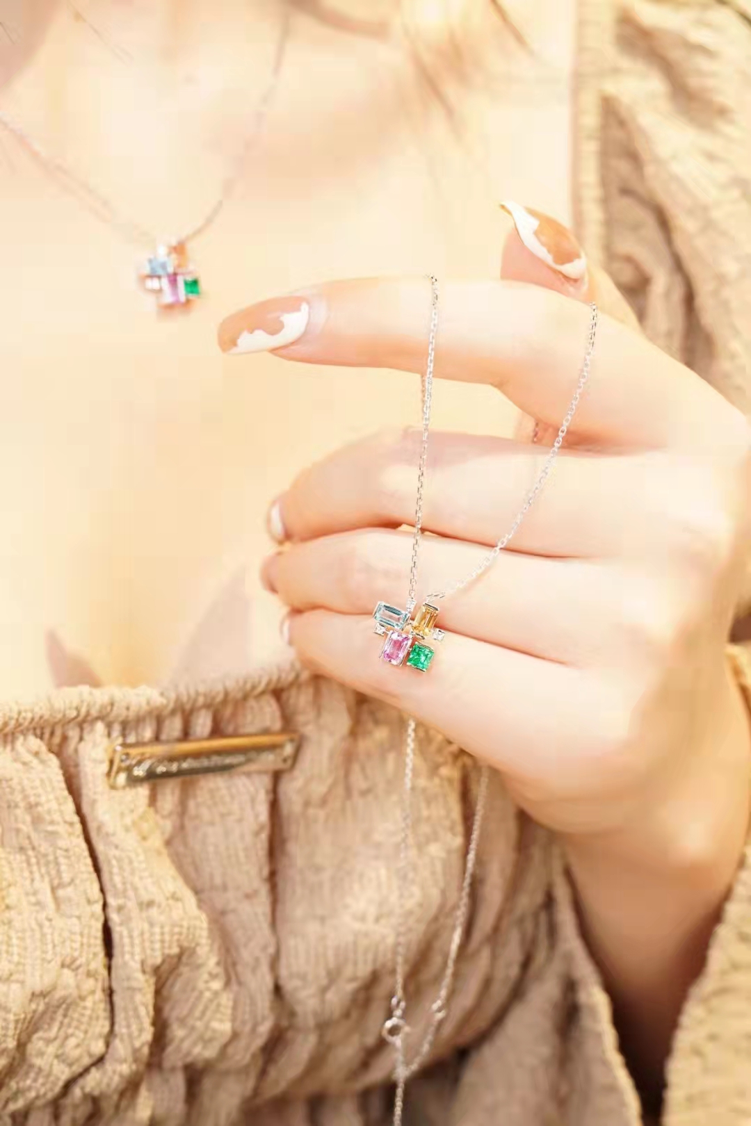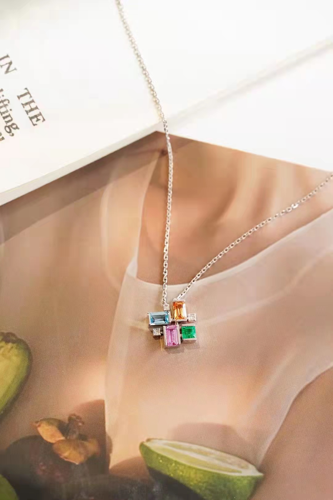 Necklace 18K Gold Aquamarine Emerald Fanta Stone Pink Sapphire