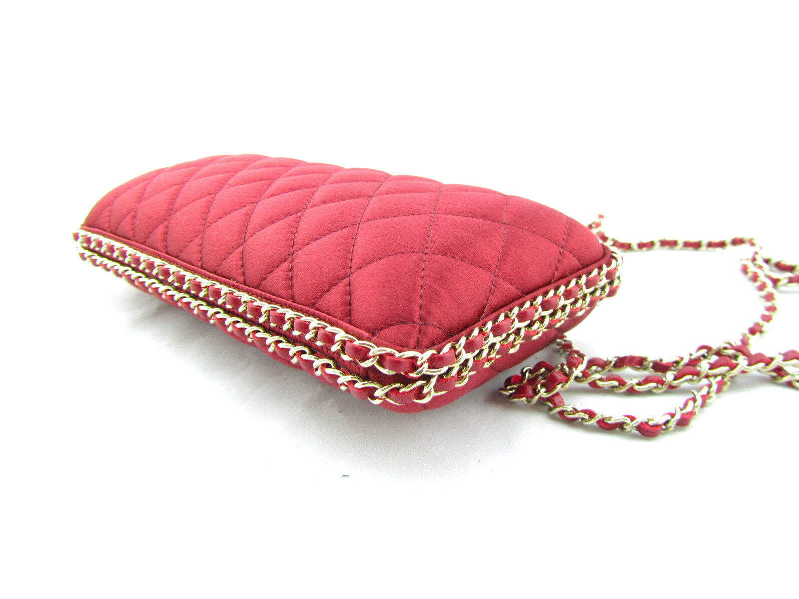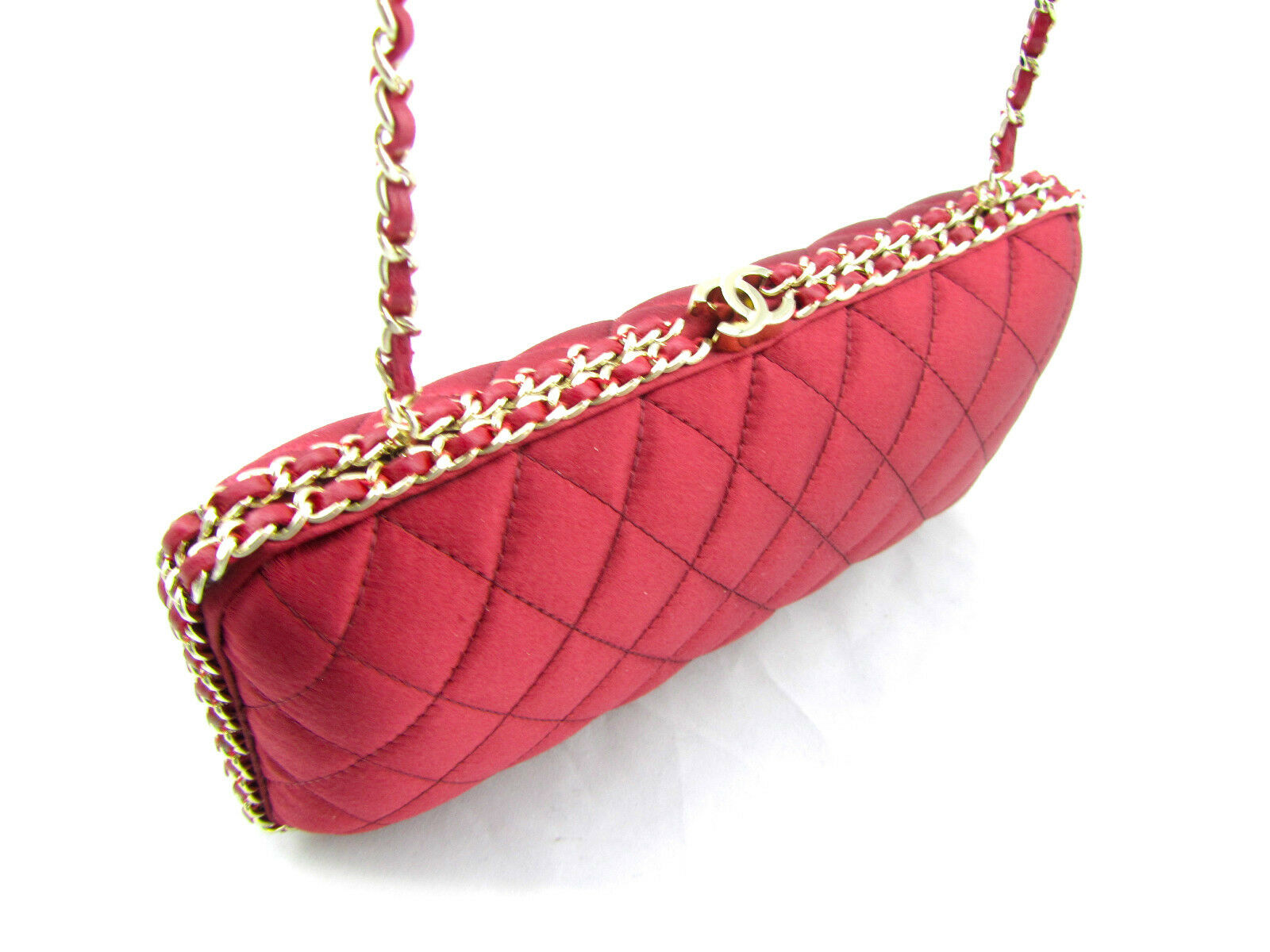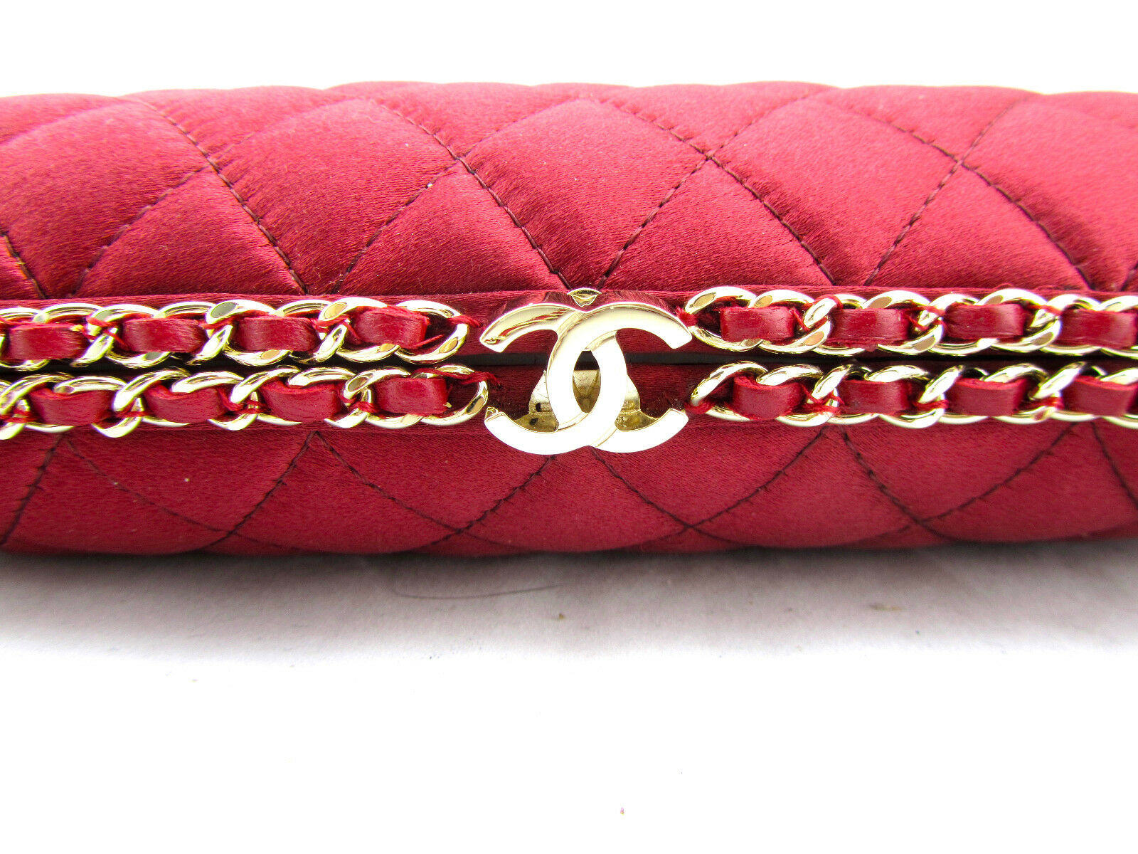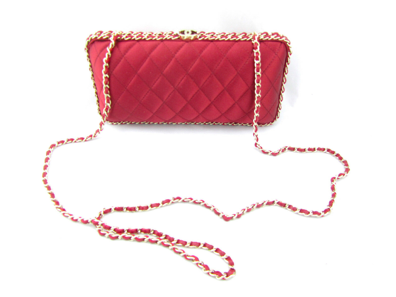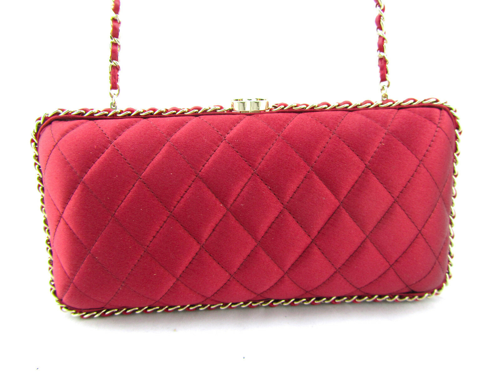 CHANEL Red Quilted Satin Box Gold Chain Clutch Crossbody Shoulder Bag New RARE