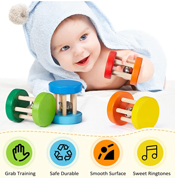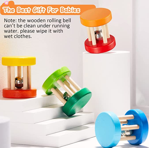 • Promote Auditory Development: these wooden baby toys are connected by five pillars, a metal bell in the middle, so they will make a crisp sound to attract babies' attention when you are shaking or rolling them, which can promote auditory development