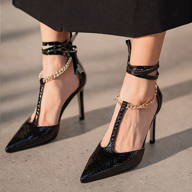 Heel shoes women's 2022 new sexy European and American chain Roman straps stiletto heel pointed temperament sandals black