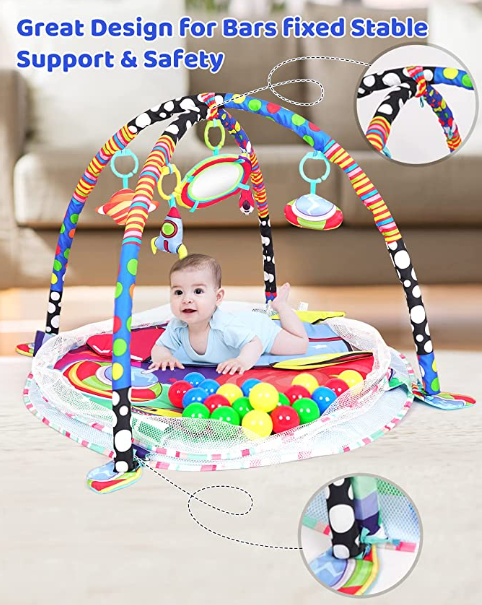 • ?COLORFUL BABY ACTIVITY GYM: Infant love to grip any new bright and colorful thing. Our activity mats come with a variety of sensory cognitive hanging toys that stimulate baby's visual, hearing and tactile, cognition and body coordination. Provides baby full of great comfort when baby lying and sitting, and plenty of space for continuous fun.