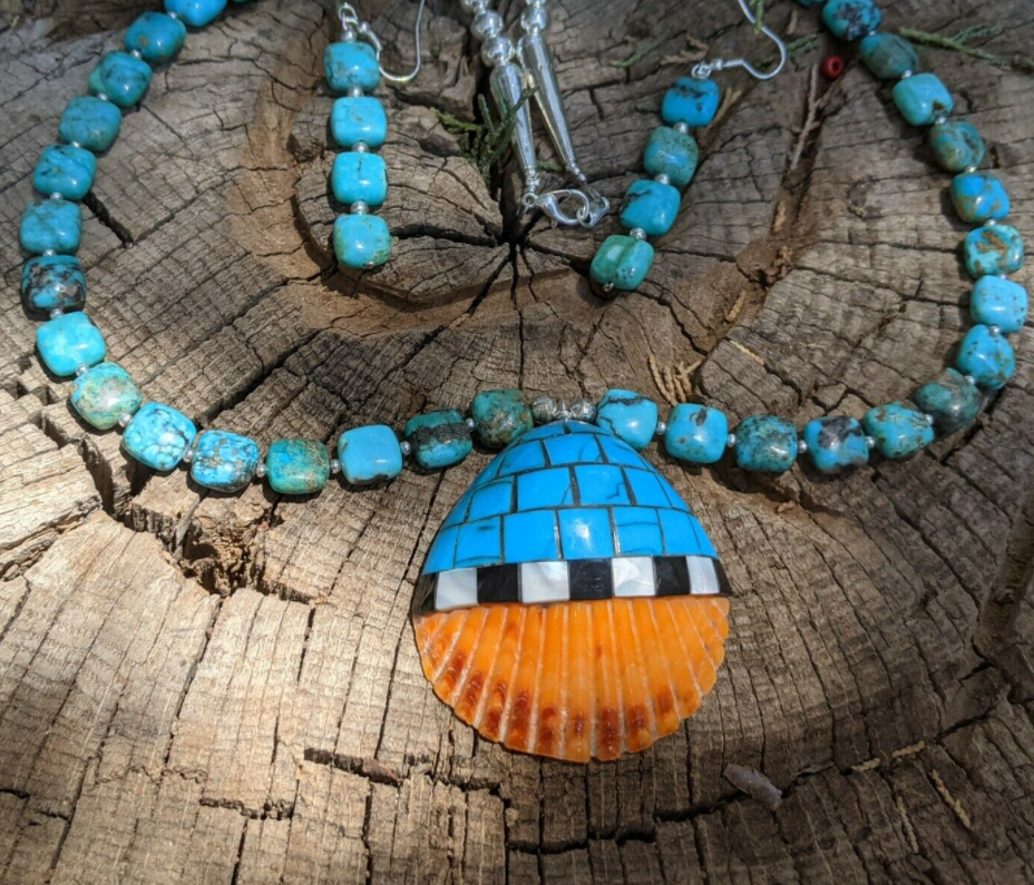 Santo Domingo Pueblo Kewa Turquoise Necklace Earrings Set w Shell Inlay Jewelry