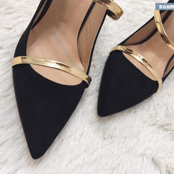 European and American black high heels women's versatile thin heel pointed back empty shallow mouth elegant sexy spelling belt color single shoes